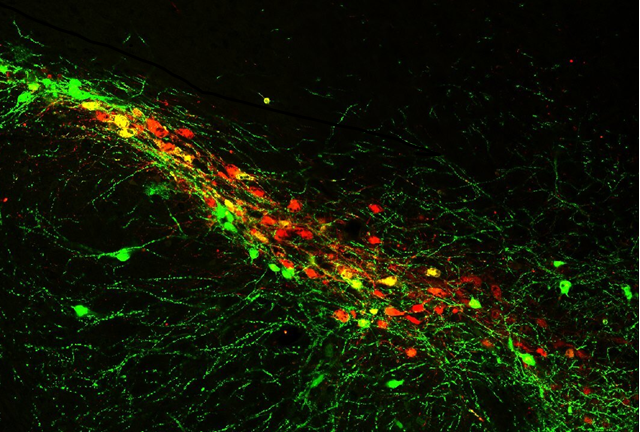 Mouse brain section displaying dopamine neurons in the substantia nigra pars compacta. These dopamine neurons are particularly vulnerable in Parkinson’s disease.